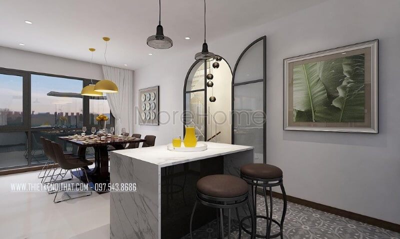Bộ bàn ghế ăn, đèn thả, tủ bếp acrylic, laminate đã tạo nên vẻ đẹp sang trọng, độc đáo cho phòng ăn liền bếp.