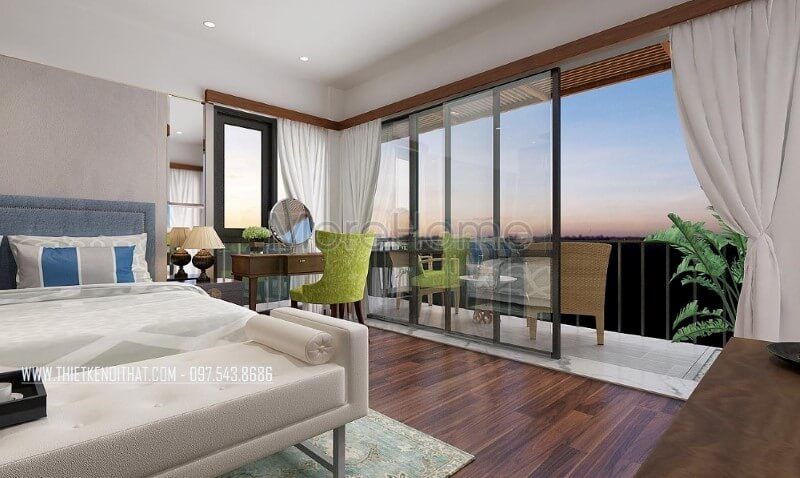 Phòng ngủ biệt thự hiện đại, thông thoáng và sang trọng bởi ý tưởng bố trí mở từ hệ cửa kính cường lực lớn giúp bạn có thể tận hưởng cảm giác trong lành, ngắm nhìn vẻ đẹp tuyệt vời từ thiên nhiên ngay tại giường ngủ của mình.