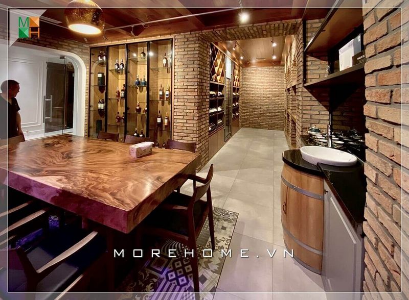 Thiết kế tủ rượu biệt thự âm tường mang phong cách tân cổ điển, bàn ghế trong phòng rượu chất liệu chính được sử dụng là gỗ tự nhiên cao cấp tạo nên vẻ sang trọng hiện đại đồng thời mang lại cảm giác ấm cúng cho phòng khách của gia chủ.