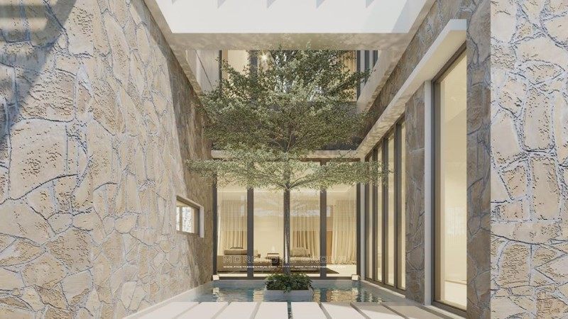 Thiết kế không gian lối đi hông nhà biệt thự đẹp và ấn tượng với hàng cây xanh mát đầy sức sống.
