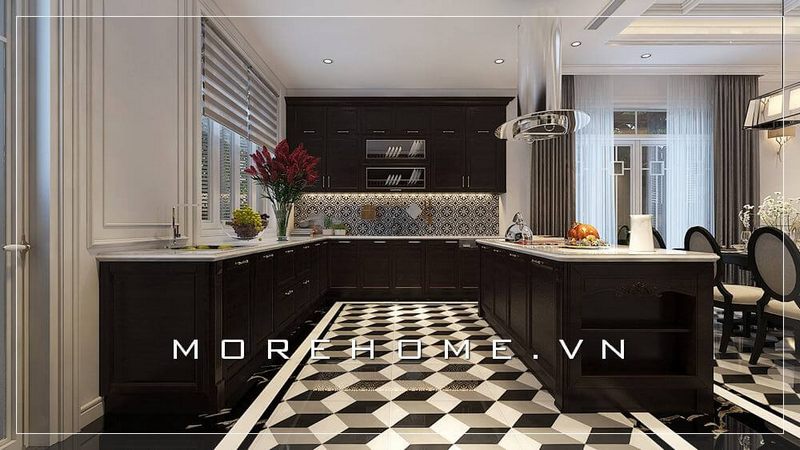 Thiết kế nội thất phòng bếp biệt thự tân cổ điển sử dụng tone màu trầm ấm cúng, sang trọng và đẳng cấp
