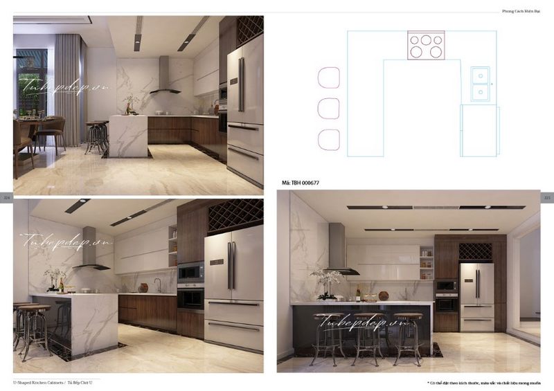 Các góc nhìn khác nhau của phòng bếp biệt thự, nhà phố gỗ óc chó hiện đại, ấm cúng mà sang trọng