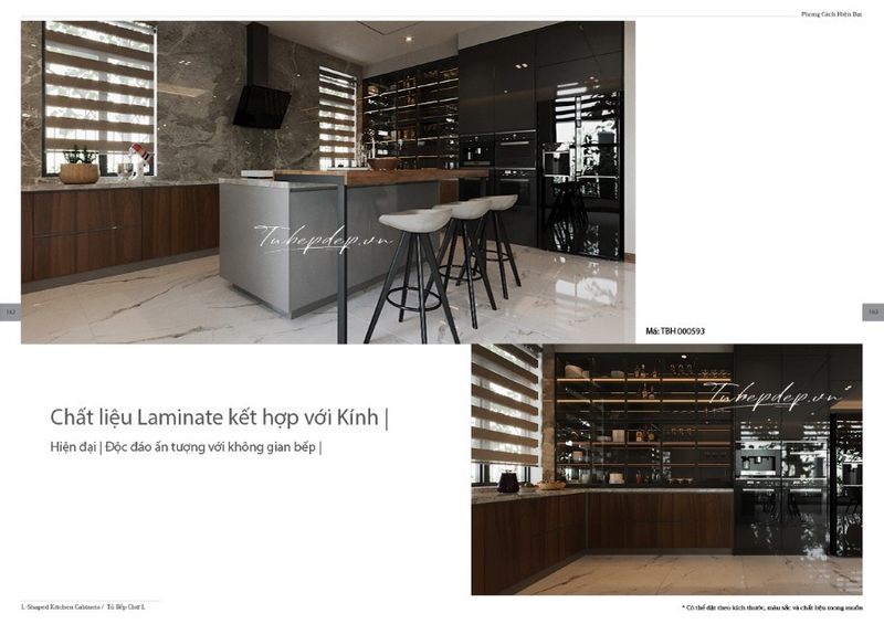 Sự kết hợp sáng tạo của các kiến trúc sư cho tủ bếp hiện đại từ chất liệu laminate với kính tạo sự mới mẻ và thuận tiện cất trữ, sử dụng đồ đạc cho phòng bếp biệt thự, nhà phố