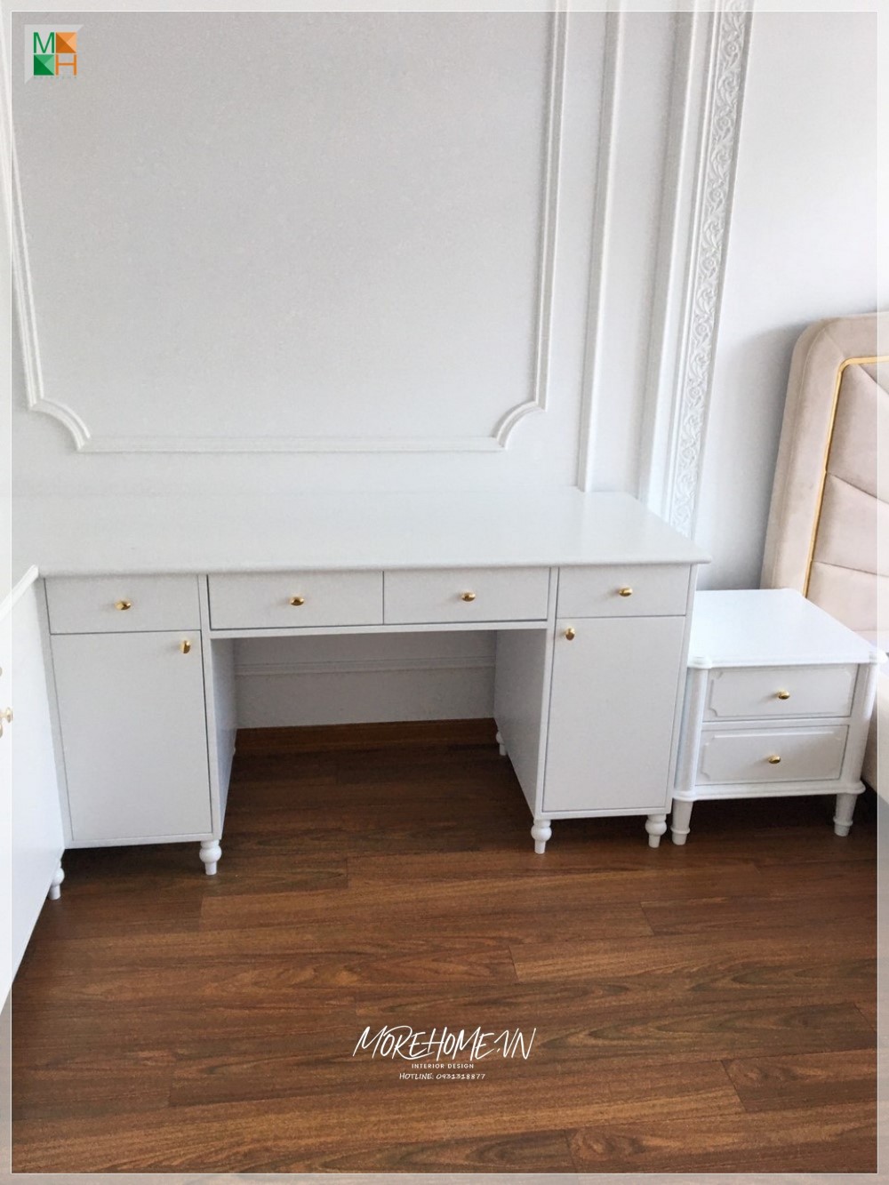 Công trình thi công bàn làm việc gỗ tự nhiên màu trắng tân cổ điển để tạo ra một không gian riêng làm việc tiện nghi.
