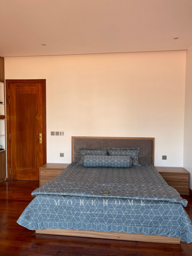 Việc thi công giường ngủ gỗ tự nhiên bọc nệm đầu giường hiện đại trong không gian nội thất của phòng sẽ giúp bạn có được một khoảng thời gian nghỉ ngơi và giấc ngủ ngon sau một ngày làm việc căng thẳng.