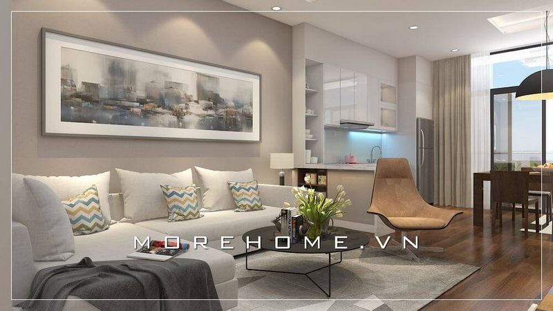 Ghế sofa hiện đại là sự lựa chọn hoàn hảo cho phòng khách chung cư với kiểu văng tiện lợi và vỏ bọc vải tone xám giúp tạo nên cảm giác thoải mái, thoáng đãng và ấm cúng.